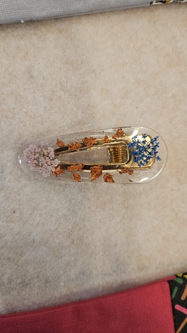 Barrette fleurs sechees feuille d or cuivrée